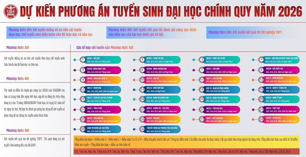 Trường Đại học Khoa học Xã hội và Nhân văn, Đại học Quốc gia Hà Nội thông báo dự kiến phương án tuyển sinh đại học chính quy năm 2026.